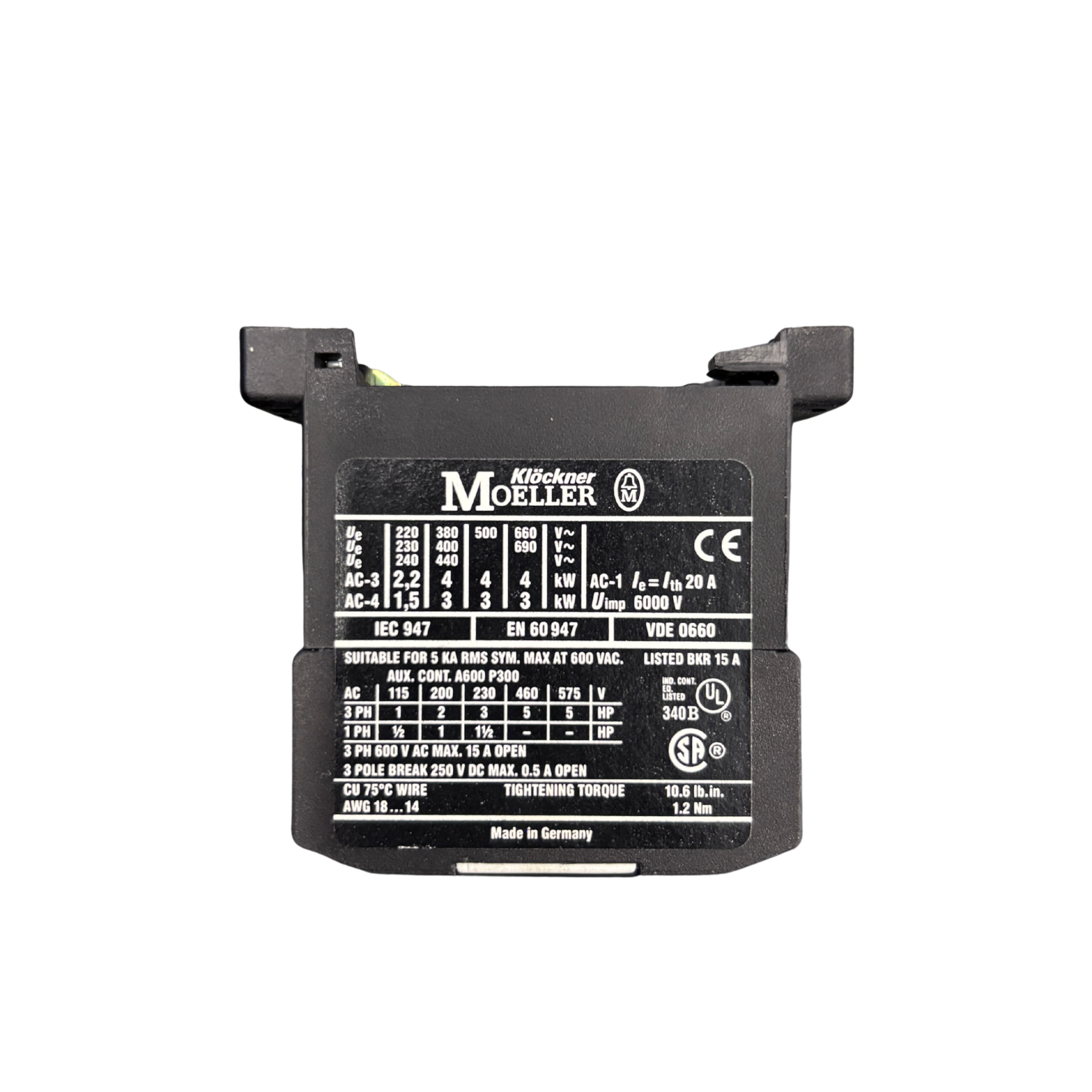 Stycznik serii DIL EM-10 firmy Klöckner Moeller przeznaczony jest do sterowania i łączenia obwodów elektrycznych w aplikacjach przemysłowych. Posiada kompaktową obudowę, zintegrowany zestyk pomocniczy oraz cewkę 24 V AC 50 Hz. Dzięki wysokiej trwałości mechanicznej i elektrycznej sprawdza się w układach sterowania silnikami, systemach automatyki oraz rozdzielnicach.