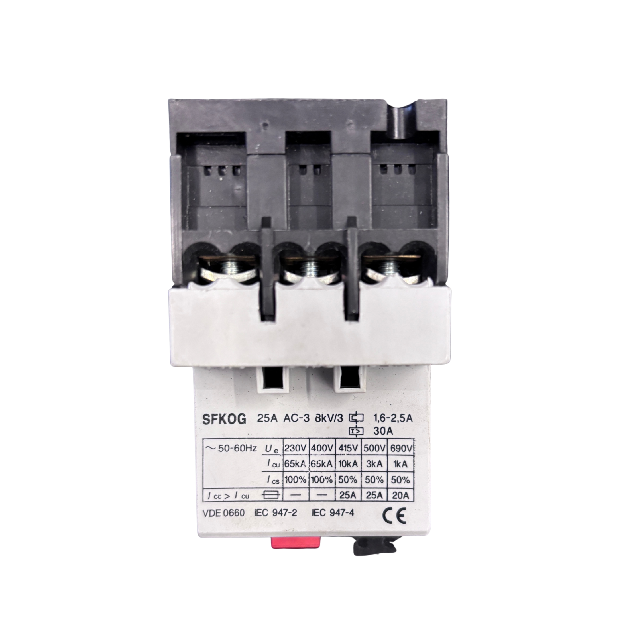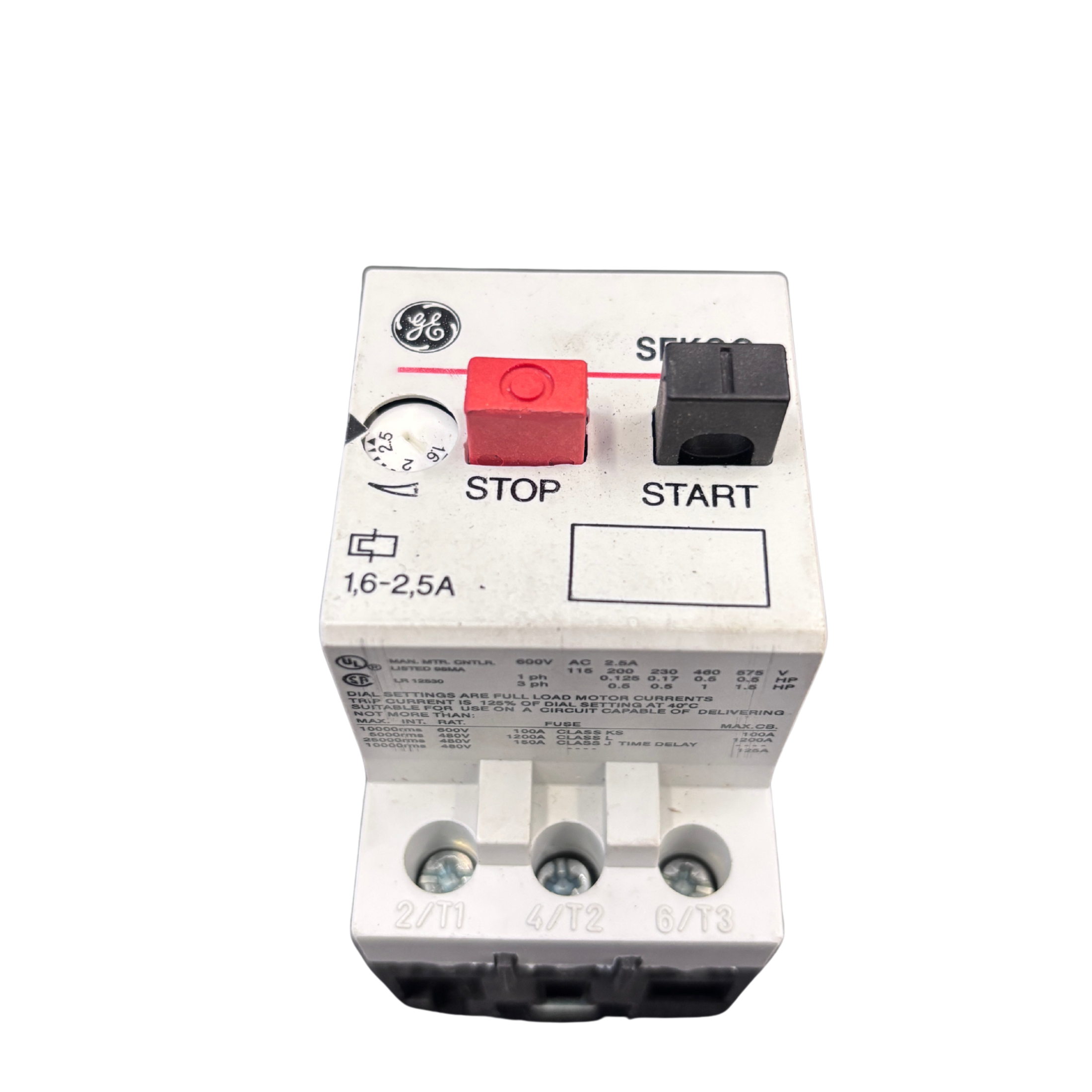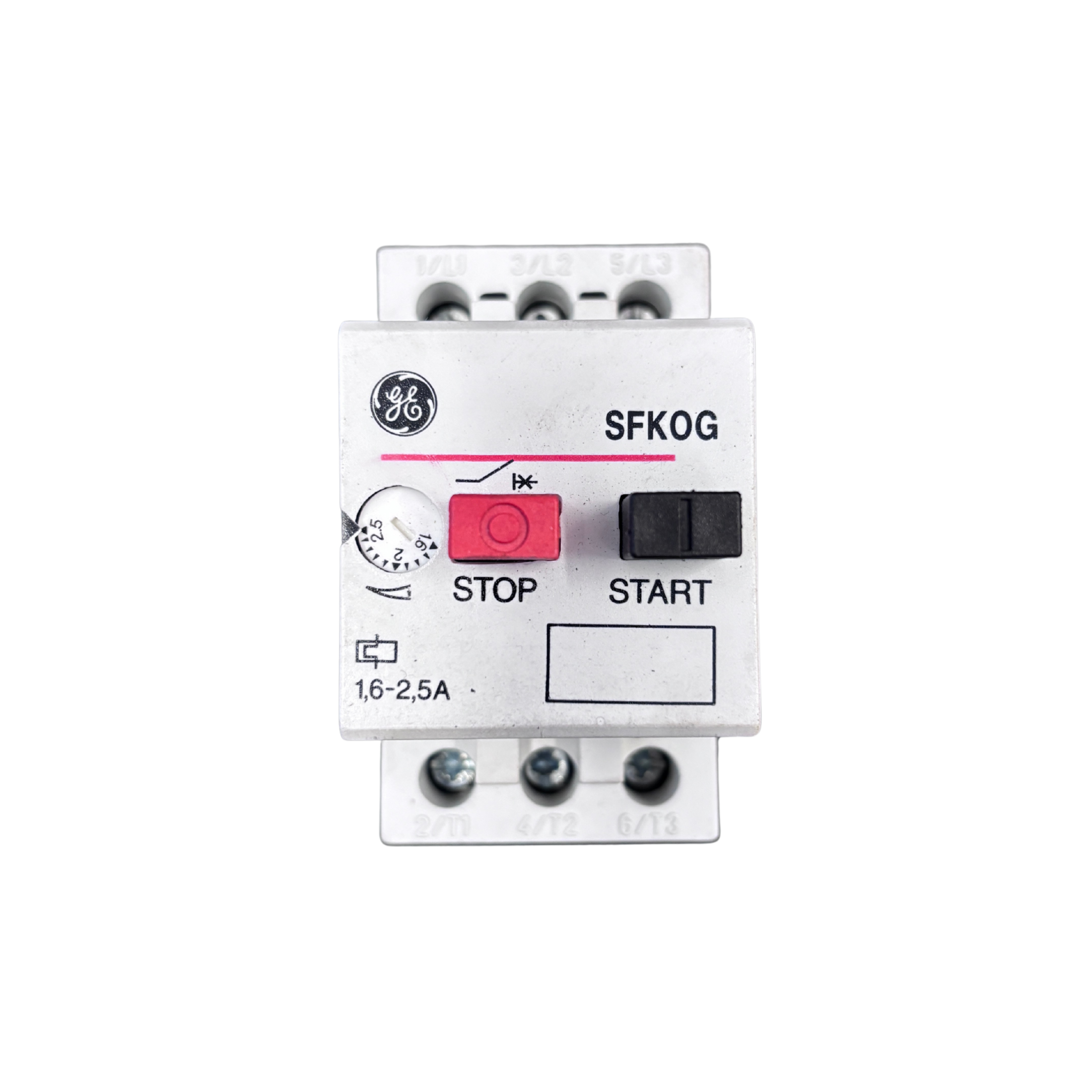 Wyłącznik silnikowy GE serii SFK0G przeznaczony jest do zabezpieczania i ręcznego sterowania silnikami elektrycznymi. Chroni przed przeciążeniami i zwarciami, posiada wbudowane przyciski START/STOP oraz pokrętło regulacyjne prądu nastawy w zakresie 1,6–2,5 A. Solidna konstrukcja i parametry zgodne z normami IEC/VDE zapewniają wysoką niezawodność w pracy przemysłowej.