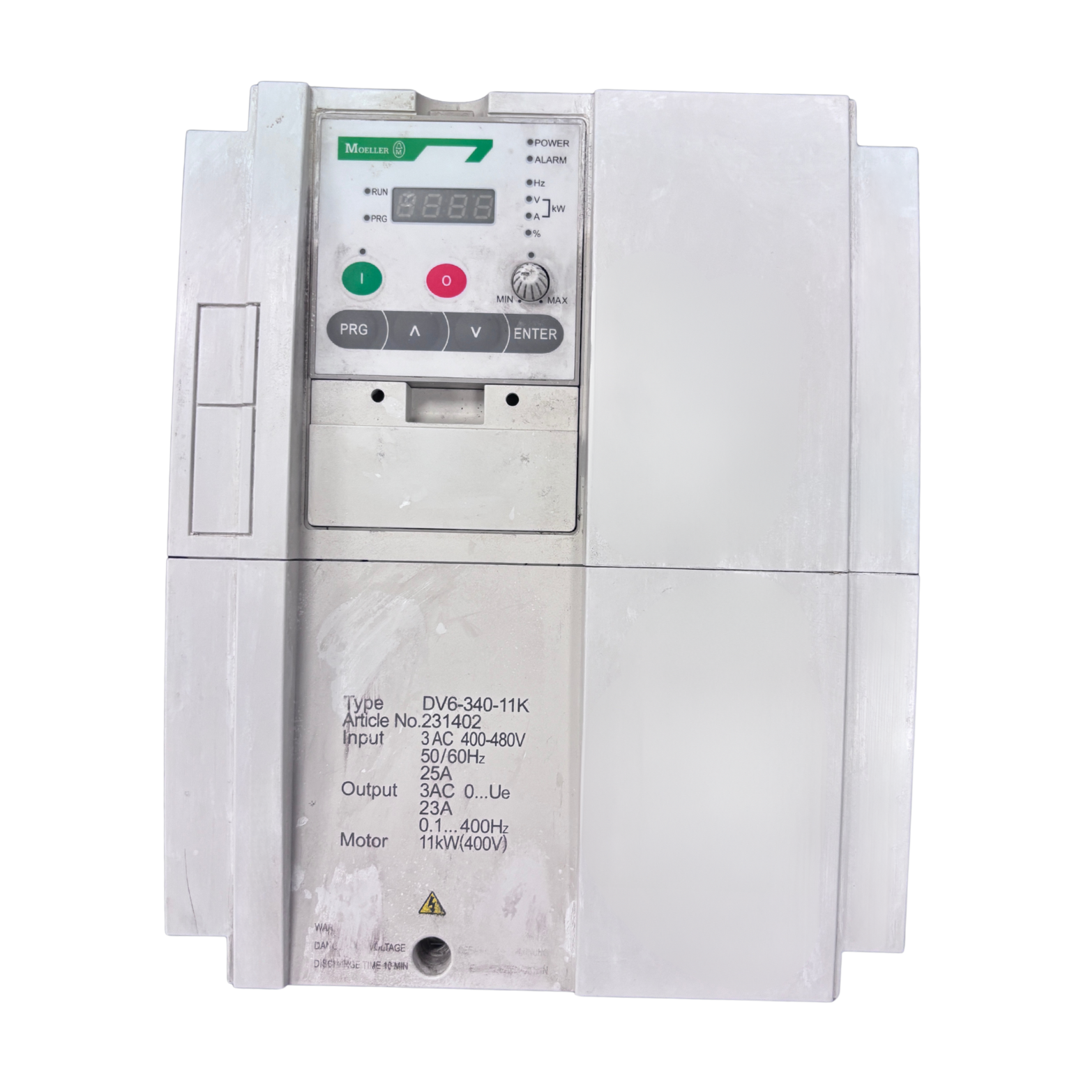 Falownik Moeller DV6-340-11K to przemiennik częstotliwości przeznaczony do sterowania silnikami asynchronicznymi 3-fazowymi. Umożliwia płynną regulację prędkości obrotowej, optymalizację pracy napędów oraz redukcję zużycia energii. Wyposażony w panel operatorski z wyświetlaczem LED i klawiaturą sterującą.